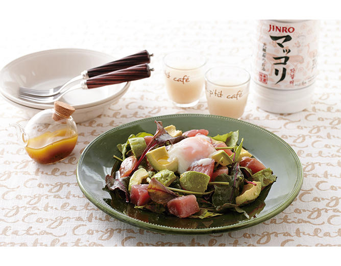 ゆっくりマッコリを楽しみたい日はコレ! 抗酸化作用のあるサーモンに、 デトックス効果のあるかんきつ類を 使ったソースをかけます。食物繊維の 多いきのことクレソンを添えれば効果倍増!