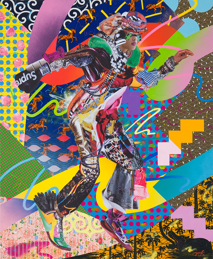 これは、ナミビアから戻ってきた後、アメリカのコロラド州デンバーに新しくオープンしたMirus Galleryのグランドオープニング展に向けて描いた作品です。今では世界中で誰もが知っているようなロゴなどをコラージュすることで、未来の新しい民族の形を表現しています。さまざまな情報が溢れる現代社会でも、共通の美的感覚をシェアしつつも、周囲に惑わされずに自分のルーツや文化の多様性、そして本能的な感覚を大事にできれば、もっと世の中楽しく健やかに生きられるようになるんじゃないかな。そんな思いを込めて制作しました。