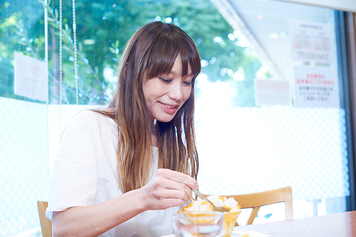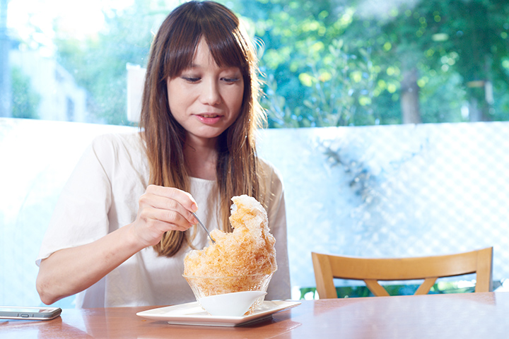 かき氷の女王こと、原田麻子さん。食べているのはふわっと紅茶が香る「アッサム&ディンブラ」800円。甘みのあるシロップは、心地よい渋みがあとを引きます。別添えの特製練乳をかけるとミルクティーに。