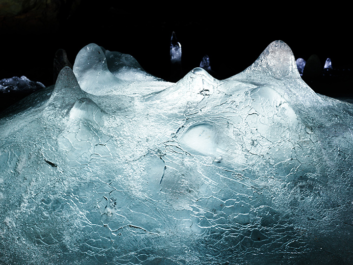 地面からポコポコと伸びる氷柱。ライトに照らされた姿は、陶酔しそうな美しさに満ちている。冬になると氷は成長するための水を失い、小さくなる。地上の四季と氷の成長は、逆転すると聞いて、ミステリアスな洞窟の魅力を再認識した。