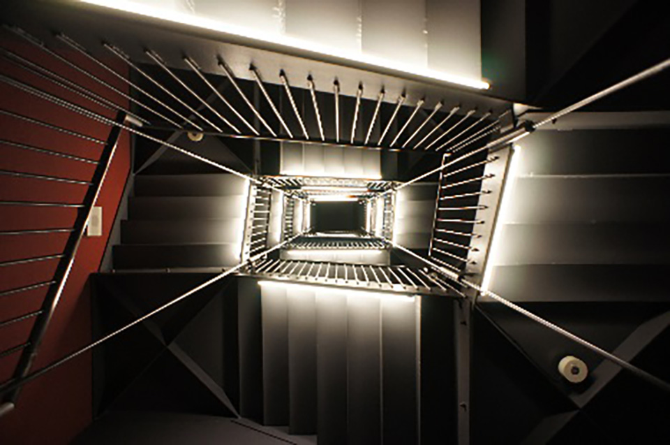 階段の裏側の蛍光灯がぼんやりと階段を照らす、四角形の螺旋階段。