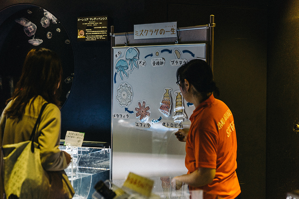 クラゲは、飼育が難しいということもまた魅力の一つなのだと奥泉さんは言います。クラゲはゼラチン質のため、デリケートで扱いが難しく、魚の飼育とは比べ物にならないぐらい大変なのだとか。最初の頃は、せっかく捕ってきても一週間ともたなかったそう。それでも奥泉さんは、お客様が喜んでくれるならと海に行ってクラゲを捕り、失敗を重ねながら飼育方法を研究し続けました。結果、今では世界中の研究者がクラゲの飼育方法を聞きに、ここへやってきます。